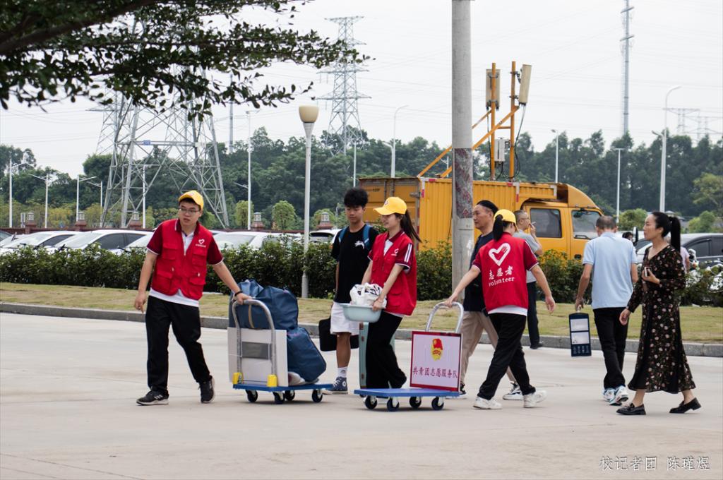 在这个秋意浓浓的雨天,新生和家长不必担心行李问题,因为我们提供了心贴“新”一站式服务,不仅有大巴车往返宿舍楼-报到点接驳新生及家长,随处可见的教职工及学生志愿者也满怀热情,指引新生。