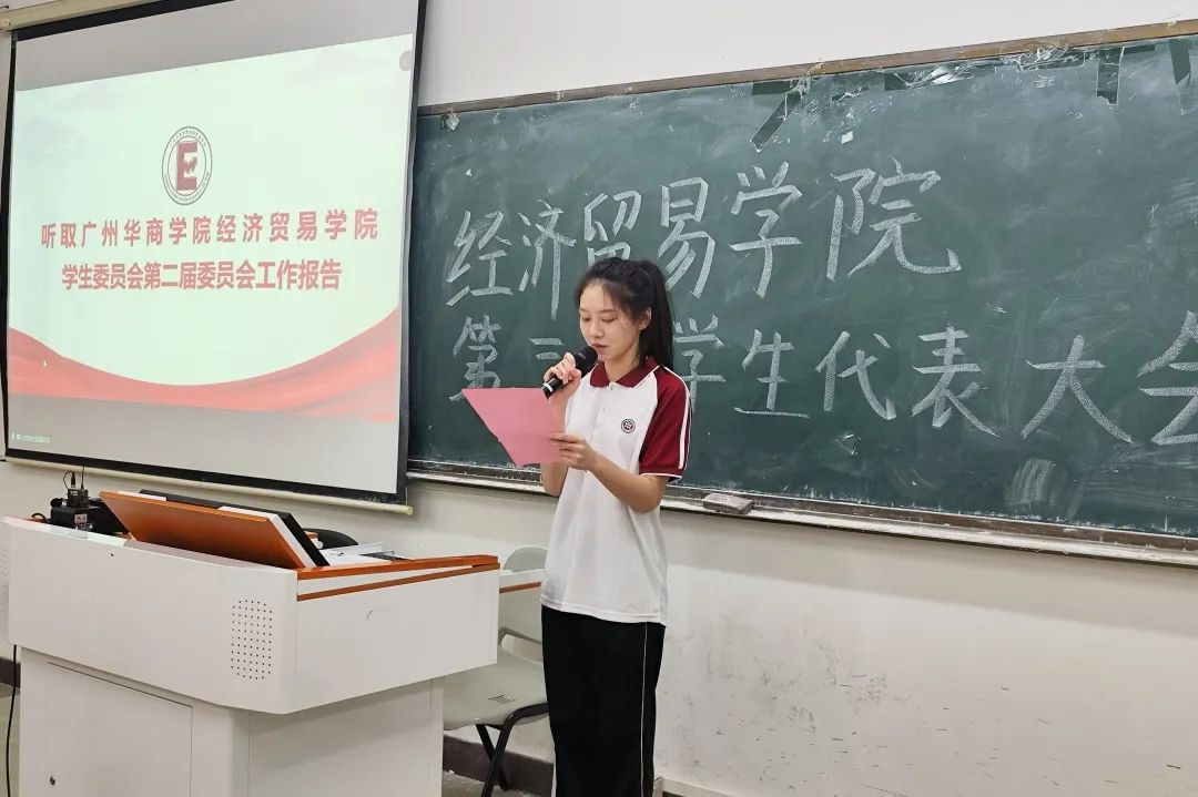 由广州华商学院经济贸易学院第二届主席团成员郑薇同学进行广州华商学院经济贸易学院第二届学生委员会工作报告。
