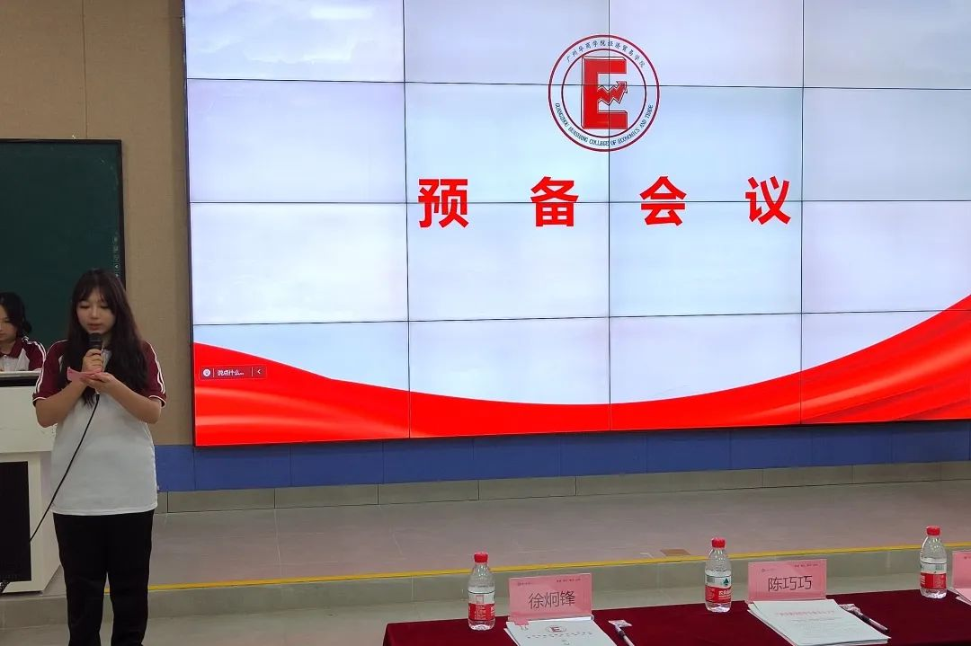 由校团委陈巧巧老师宣读广州华商学院学生委员会《关于同意召开广州华商学院经济贸易学院第三次学生代表大会的批复》。