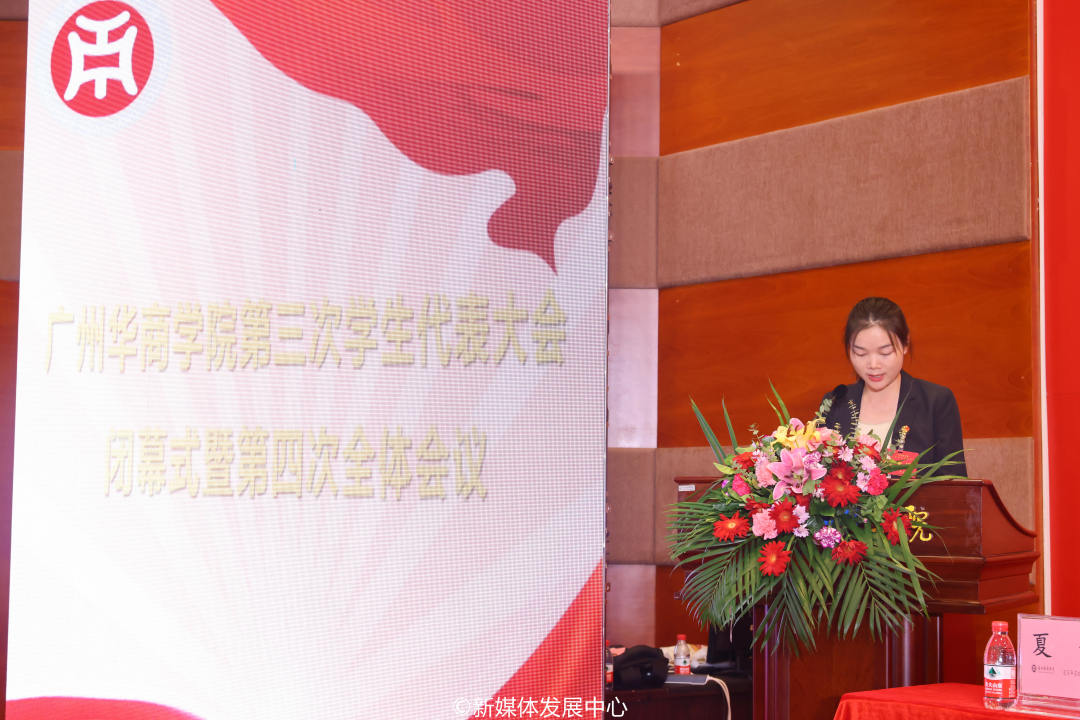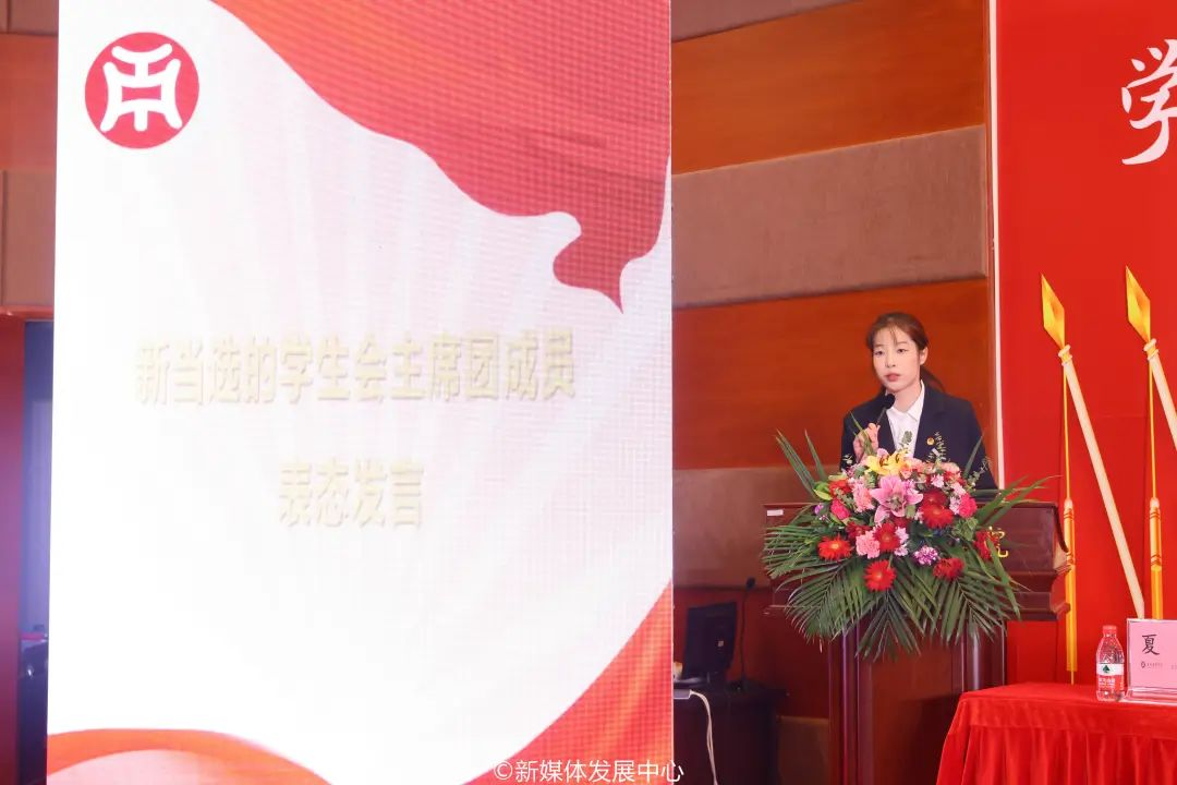 新当选主席团成员尤晓雯表态发言。广州华商学院第三届学生会将以此为基点,全面学习宣传贯彻党的二十大精神,高举习近平中国特色社会主义思想伟大旗帜,秉承全心全意为同学服务的根本宗旨,坚定“从同学中来、到同学中去”的工作方向,努力提升学生会组织的同学满意度、大局贡献度和社会认可度,树立富有理想、关心同学、清新阳光的组织形象。