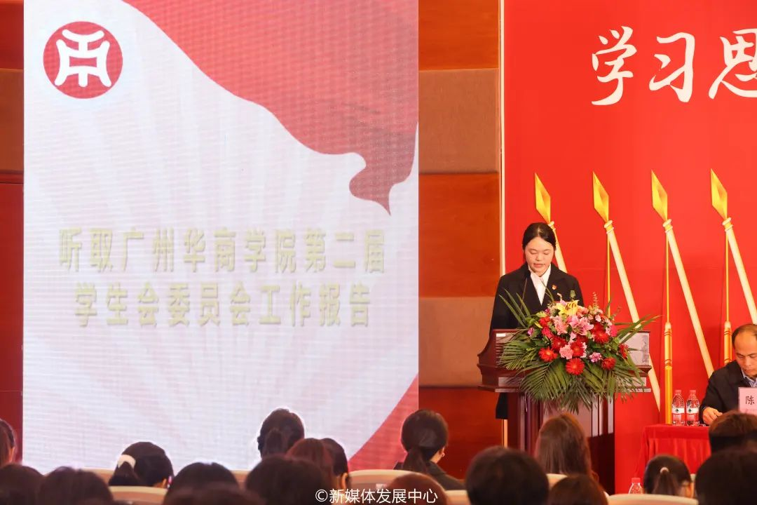 广州华商学院第二届学生会主席团成员黄朵懿向大会作工作报告。报告提到,过去一年中校学生会主要开展的工作有:一、不忘初心跟党走,扎实强化思想引领;二、围绕大局谋服务,始终把提升服务水平作为工作核心;三、把握学业主线,学风建设形式多样;四、加强文化建设,丰富校园文化生活;五、强化学生会改革,进一步提高学生会战斗力;六、投身社会实践,彰显责任担当。在未来,校学生会将继续坚持党的领导,团结带领华商学子坚定理想信念、奋发成长成才、助力创新创造、展现青春作为,在全面建设社会主义现代化国家的火热实践中贡献华商青春力量。