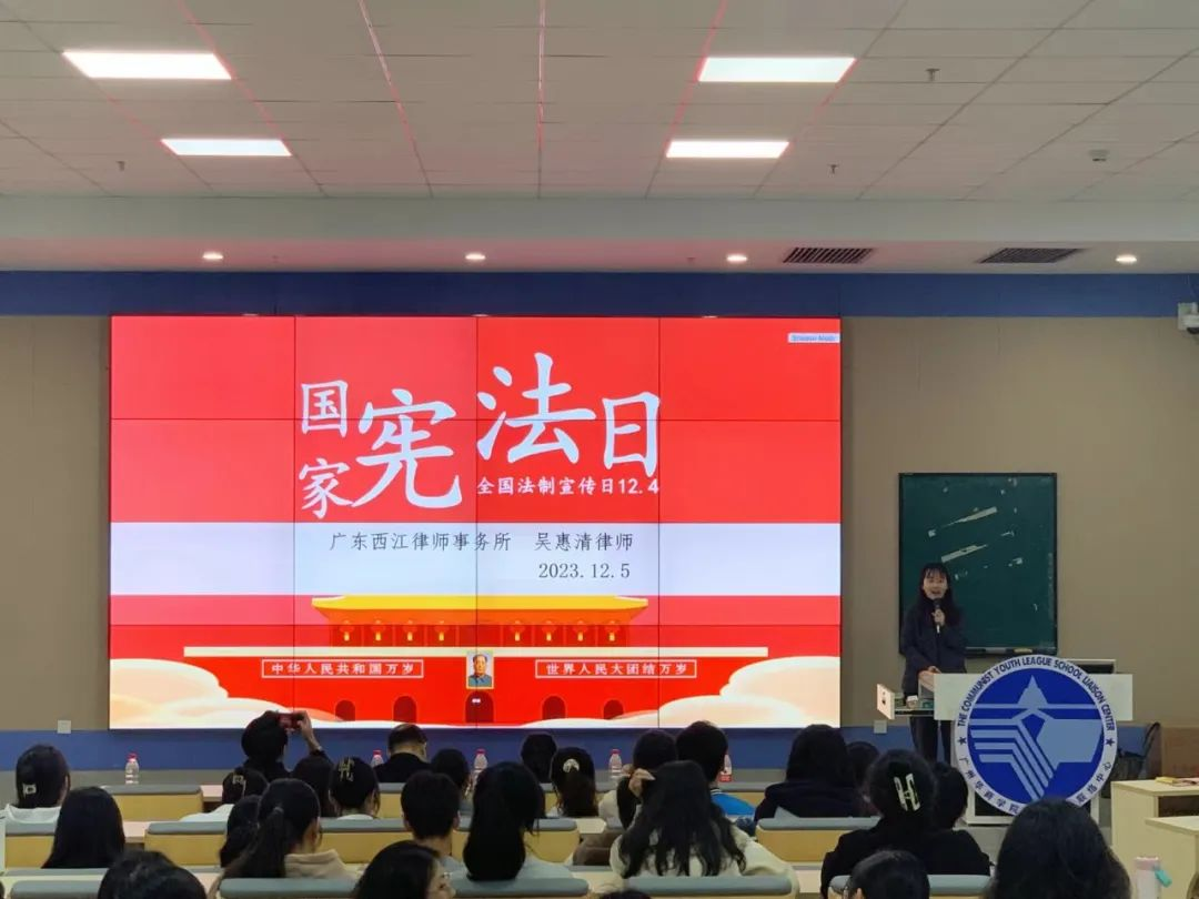 为进一步学习领会习近平新时代中国特色社会主义思想,学习贯彻习近平法治思想和党的二十大精神,加强校地共青团合作共建,在华商青年中营造弘扬宪法精神、维护宪法权威的良好氛围,在学校党委支持下,12月5日,学校团委联合中国人民银行肇庆市分行、肇庆市金融消费权益保护联合会、共青团四会市委员会等多家单位、机构在肇庆校区开展“大力弘扬宪法精神 建设社会主义法治文化”肇庆(四会)金融法治赋能“百千万工程”和乡村振兴宣传大讲堂进高校活动。活动由校团委对外联络中心承办。