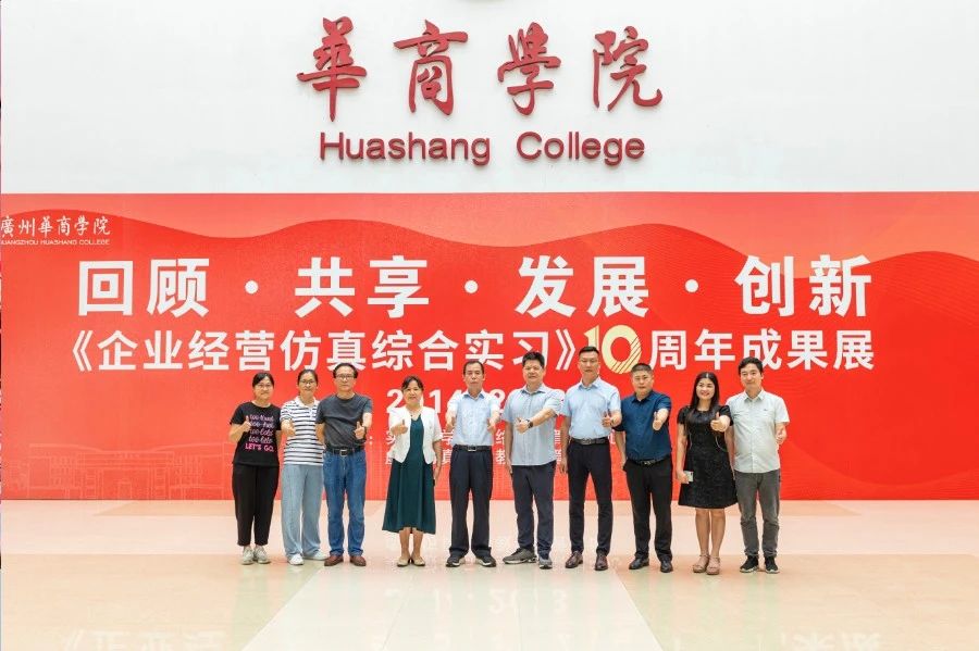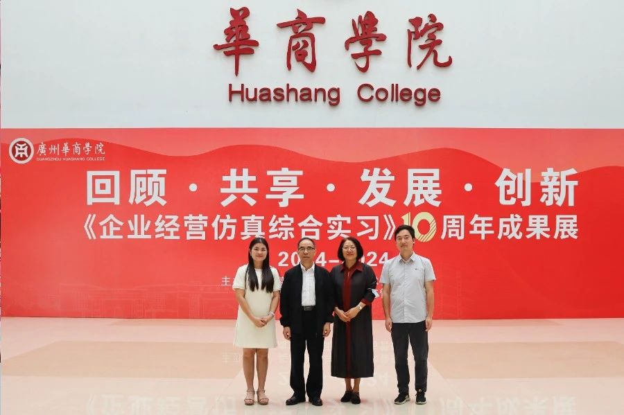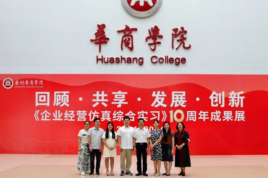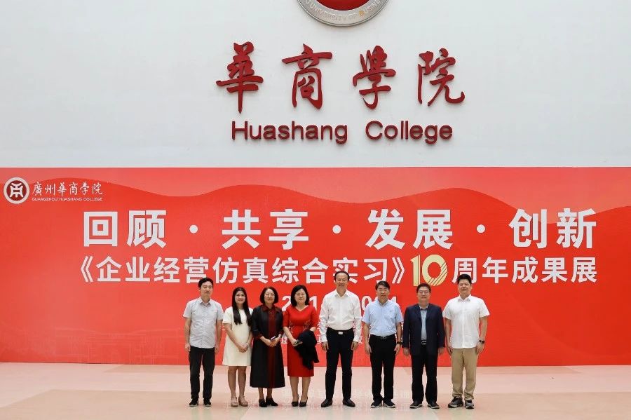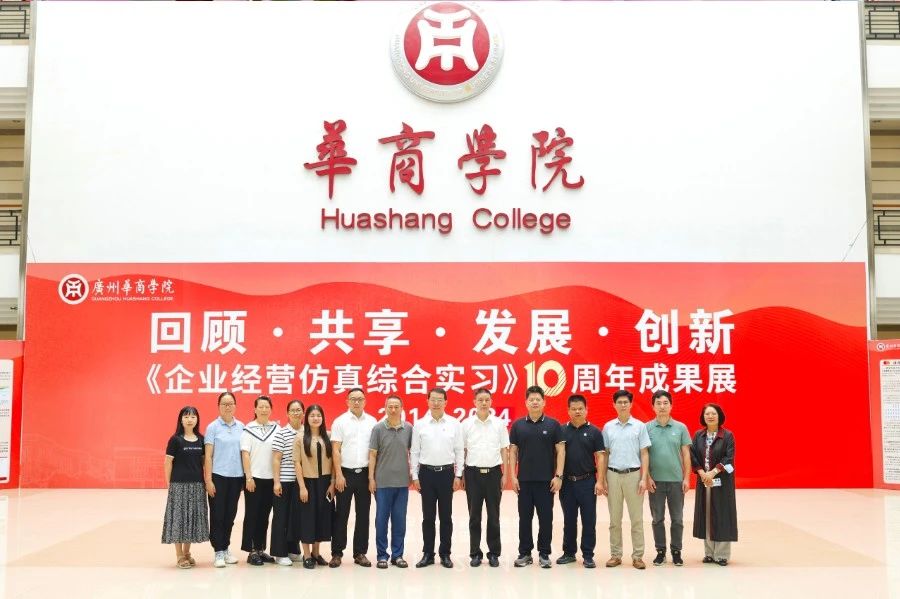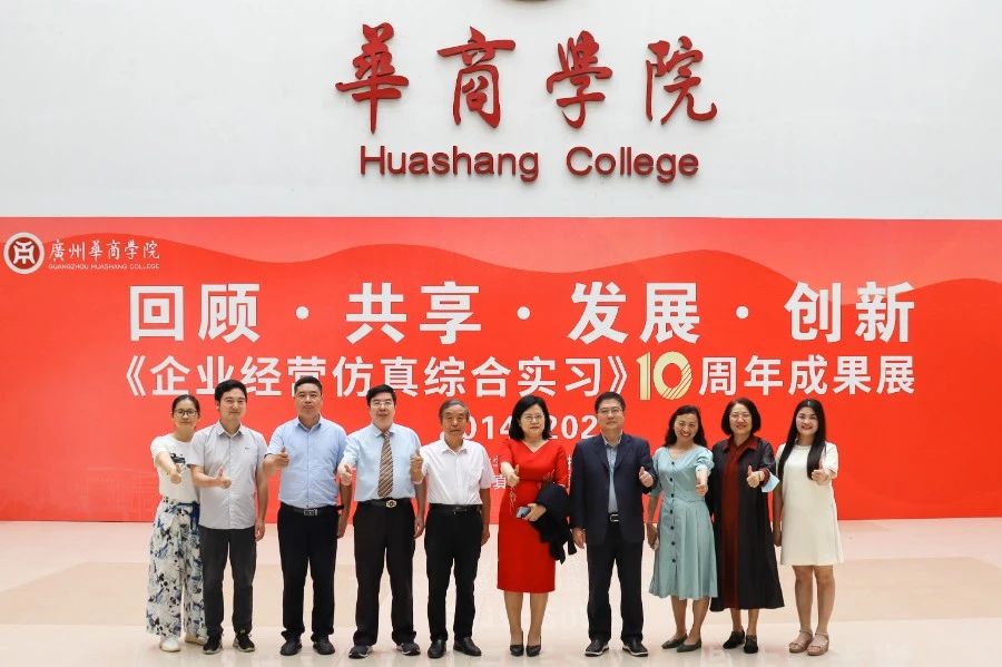 华商教育集团董事长廖榕就,学校总督学,党委书记陈玉欢,副校长刘少波、吕峻闽,学校顾问郭银华,广东财经大学国家级实验教学中心主任姚维保,副主任李立君,教学部部长陈韦伶,广东白云学院经管中心主任贺雪荣,广州华商学院会计学院、管理学院、人工智能学院等院系领导及师生,共同参观了《企业经营仿真综合实习》课程10周年成果展,见证了课程发展建设的阶段性“成绩单”。