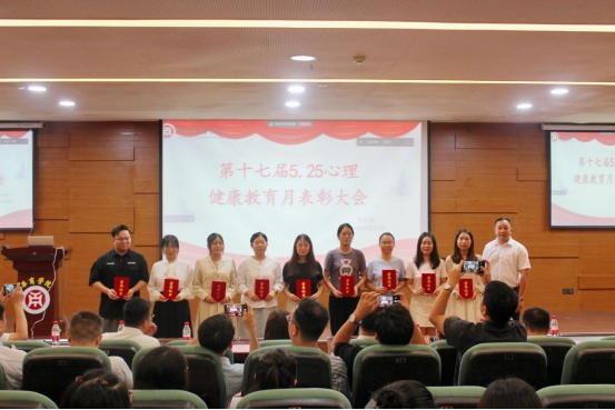学生处黄国富处长宣读《关于表彰广州华商学院2023-2024学年心理健康教育工作先进集体和个人的决定》。传播与传媒学院、健康医学院荣获优秀心理健康教育工作先进集体称号;文学院学生心理健康协会、健康医学院学生心理健康协会荣获优秀学生组织称号;杨雪、王容章、李馨怡、江嘉丁、陈禄汉、王洁、魏巍、李芸芸、赵颖祯荣获优秀心理健康教师称号;谭茵琪等231名同学荣获优秀心理健康学生骨干称号。