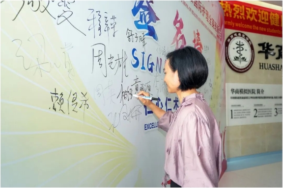 迎新现场,鲜红的标语、新生签名墙等布设见证着同学们朝气蓬勃、投身健康医疗事业的新开始。