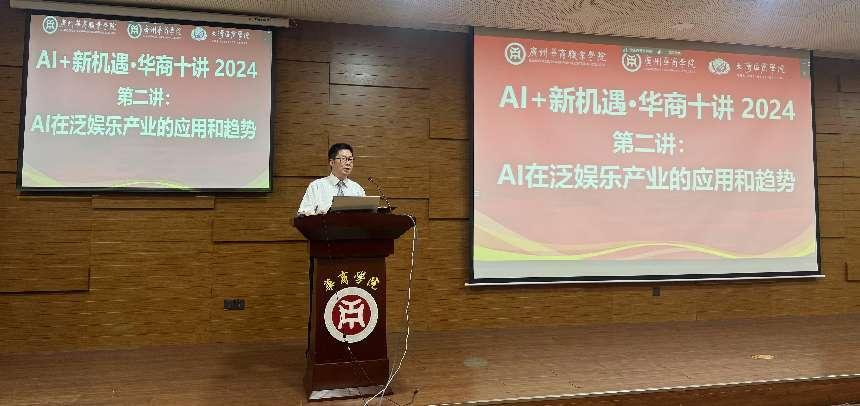 9月24日下午,华商教育集团旗下三所院校,广州华商学院、大湾区商学院、广州华商职业学院联合举办的大型系列公益讲座“AI+新机遇•华商十讲”之第二讲“AI在泛娱乐产业的应用和趋势”在广州华商学院图书馆举行。粤港澳三地近3500人线上线下参加此次活动。蓝海国际资本有限合伙基金合伙人李嘉俊先生为本次讲座的主讲人。中汇集团印国庭总监、大湾区商学院协理副校长陈行健教授、广州华商学院校长助理张军教授、国际交流与合作处王文忠处长、广州华商职业学院国际教育学院钱芳院长及师生代表参加现场活动。
