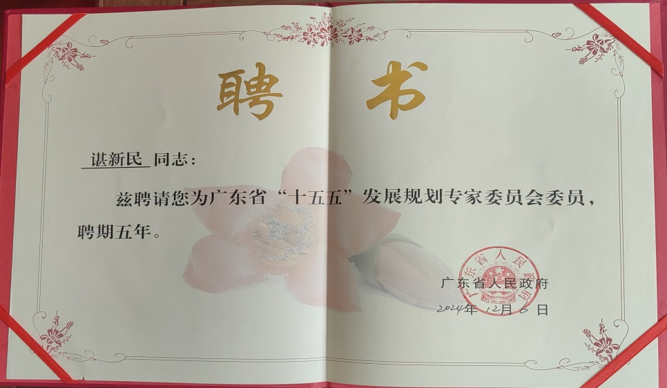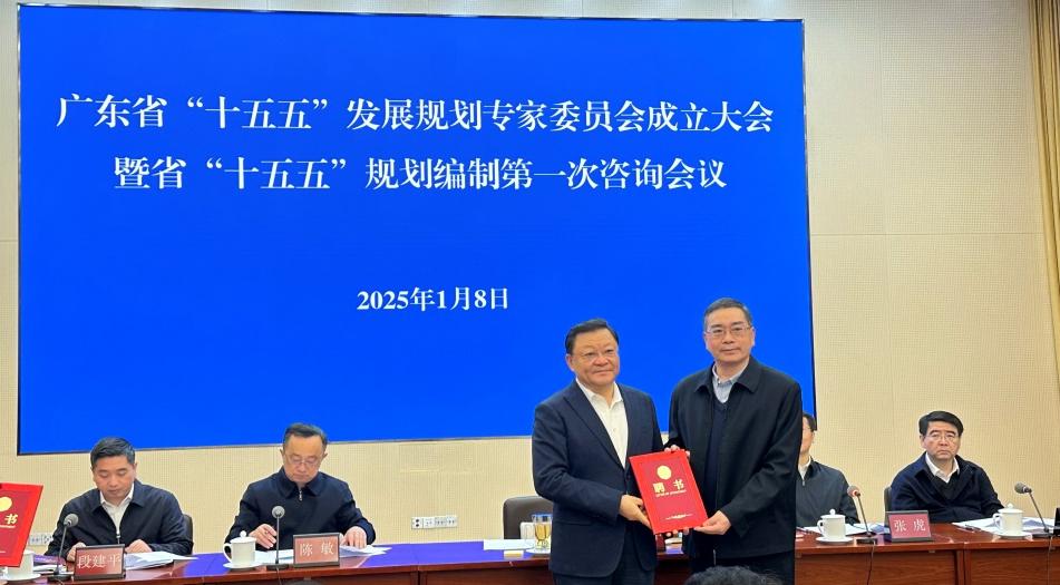 2025年1月8日,广东省人民政府“十五五”发展规划专家聘任仪式在省政府办公厅举行。我校特聘教授、粤港澳大湾区研究院院长谌新民教授受聘为广东省“十五五”发展规划专家委员,并接受王伟中省长颁发的聘书。