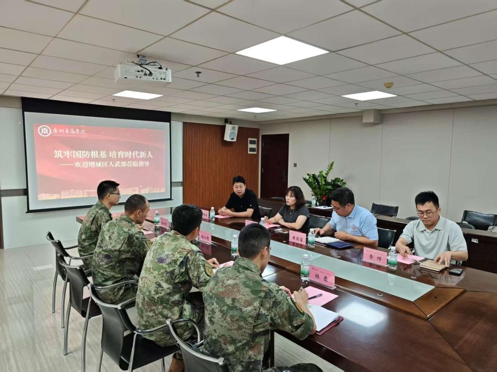 为深入学习贯彻习近平强军思想,落实全国、全省大学生征兵工作精神,切实提升大学生征兵工作成效,6月5日下午,增城区人民武装部杨从辉部长率队,带领人武部专干到我校开展2025年征兵工作调研。学校党委委员、副校长许娜同志,党委学工部部长、武装部部长黄国富同志及征兵工作相关工作人员参加座谈会。
