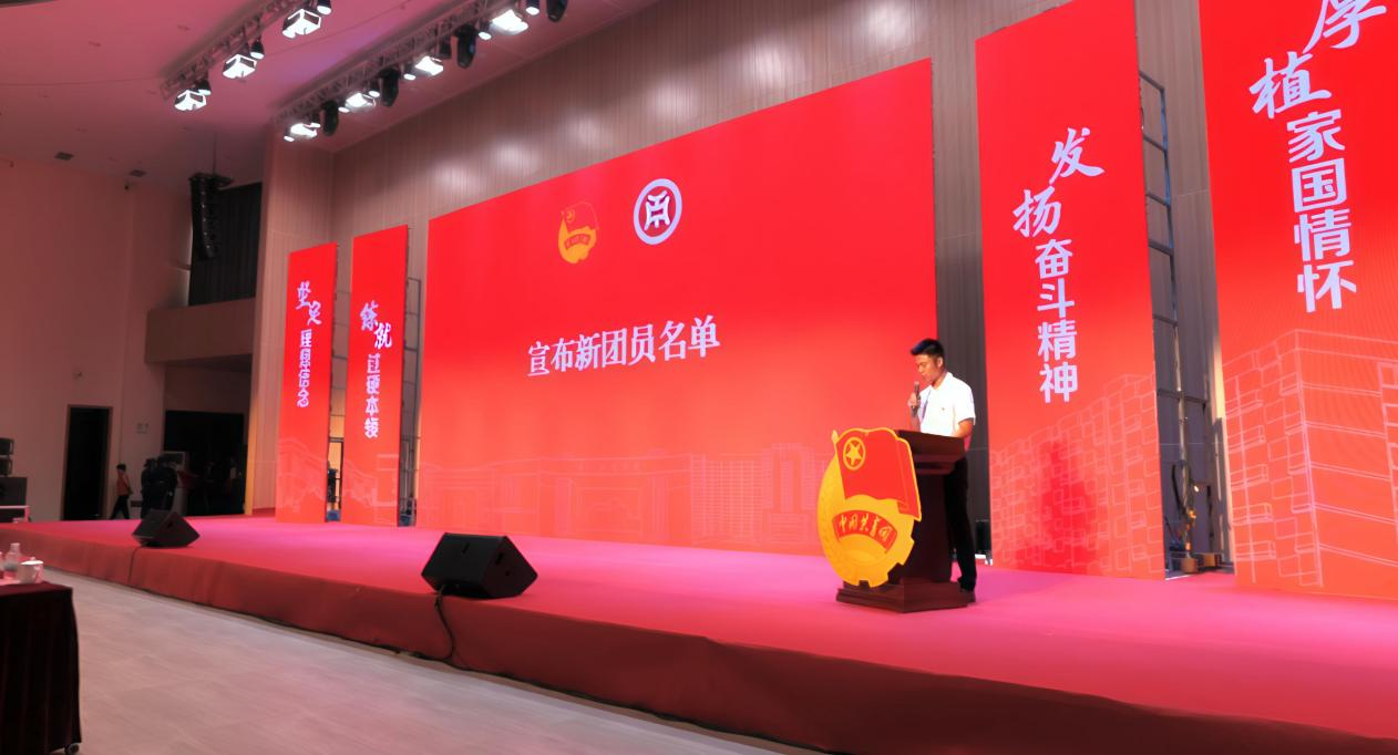 (团四会市委书记崔冰娜为新团员代表颁发团徽徽章和团员证)