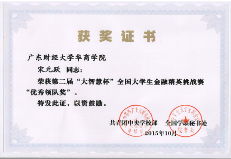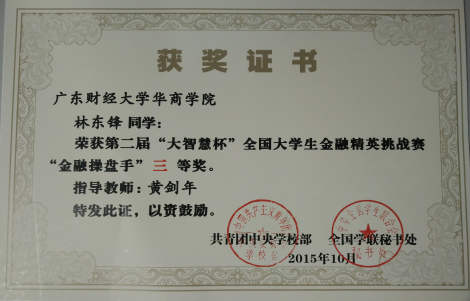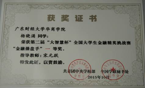 我院学子在4436位参赛选手中脱颖而出。经济与金融系2012级杨晓涌同学荣获第二届“大智慧杯”全国大学生金融精英挑战赛“金融操盘手”一等奖,指导老师宋元跃荣获“优秀领队奖”。会计学院2013级林东锋同学获第二届“大智慧杯”全国大学生金融精英挑战赛“金融操盘手”三等奖,指导老师黄剑年。