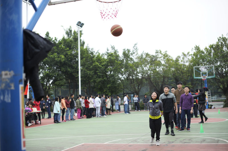 随后,比赛正式开始。分两个项目进行,分别为投篮接力和集体跳绳。投篮接力中,每队10人(男、女各半),比赛时间五分钟。沿罚球线站成一路纵队队,第一名队员手持一篮球;听到裁判员“开始”口令后第一名队员开始投篮,然后自抢篮板球,把球交给第二名队员,跑到队尾,循环接力。