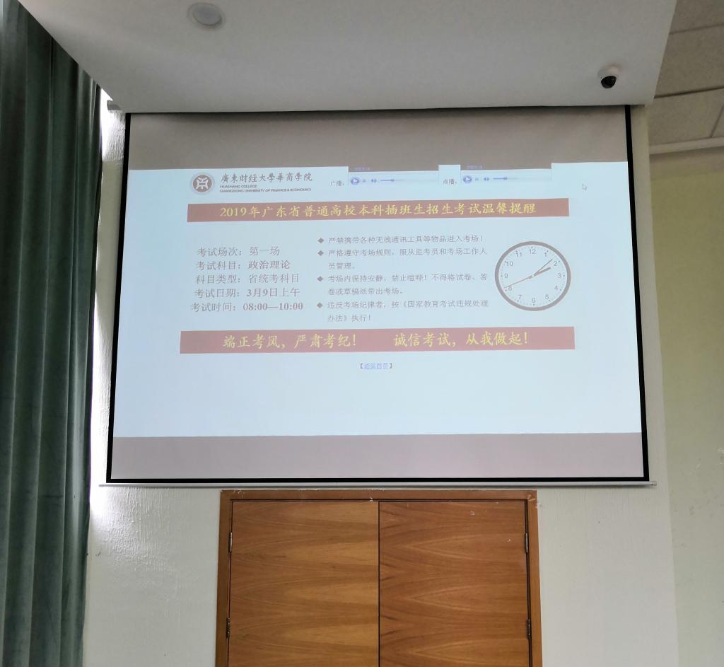 今年华商学院考点在考务工作上不断创新,在去年使用考场内播放“考试温馨提醒”PPT、统一布置考场的基础上,今年校团委录制了《考场规则》音频,实验教学与网络技术管理中心(技术支持组)开发了考务管理系统,通过网络统一播放《考场规则》和“考试温馨提醒”,在考场屏幕上显示考试科目、时间,考场纪律,另外还有时钟显示,受到了监考老师和考生们的欢迎与好评。