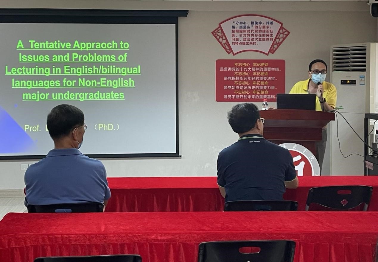 6月22日,我校双语、全英教师培训系列讲座第三讲于行政楼502室举行。本次讲座由国际学院副院长黎平海教授主讲,钟森文副校长出席讲座,国际交流与合作处王文忠处长主持讲座。