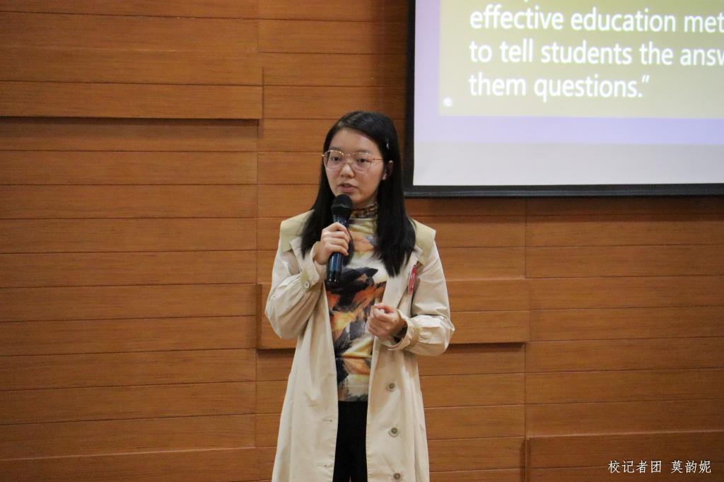 来自教师教育学院的王微雨老师结合自身的教学经历,阐述了对“最有效的教育方法不是告诉学生答案,而是向他们提问”的看法,其认为比起直接告诉学生答案,提问问题的教学方式更能激发学生对答案的好奇心,更能锻炼学生的创造性与辩证思维,更能增强教学互动性,激发学生的兴趣。