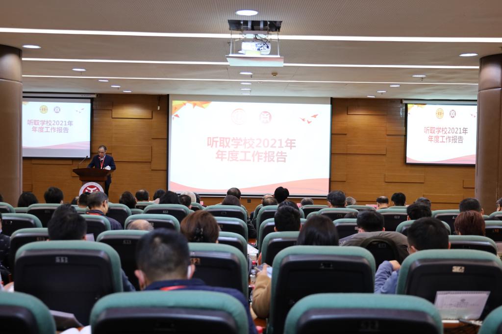 报告从党团建设、教学改革、科学研究、师资建设、学生管理、招生就业、创新创业、国际交流等十二个方面总结回顾学校2021年的主要工作,指出当前面临的主要问题,明确2022年学校工作思路:全面推进依法治校,认真落实党建工作重点任务;加强专业内涵建设,打造品牌与特色专业;以合格评估及硕士学位建设为契机,进一步加强师资队伍建设;落实规范达标,加大办学投入,完善基础设施建设。