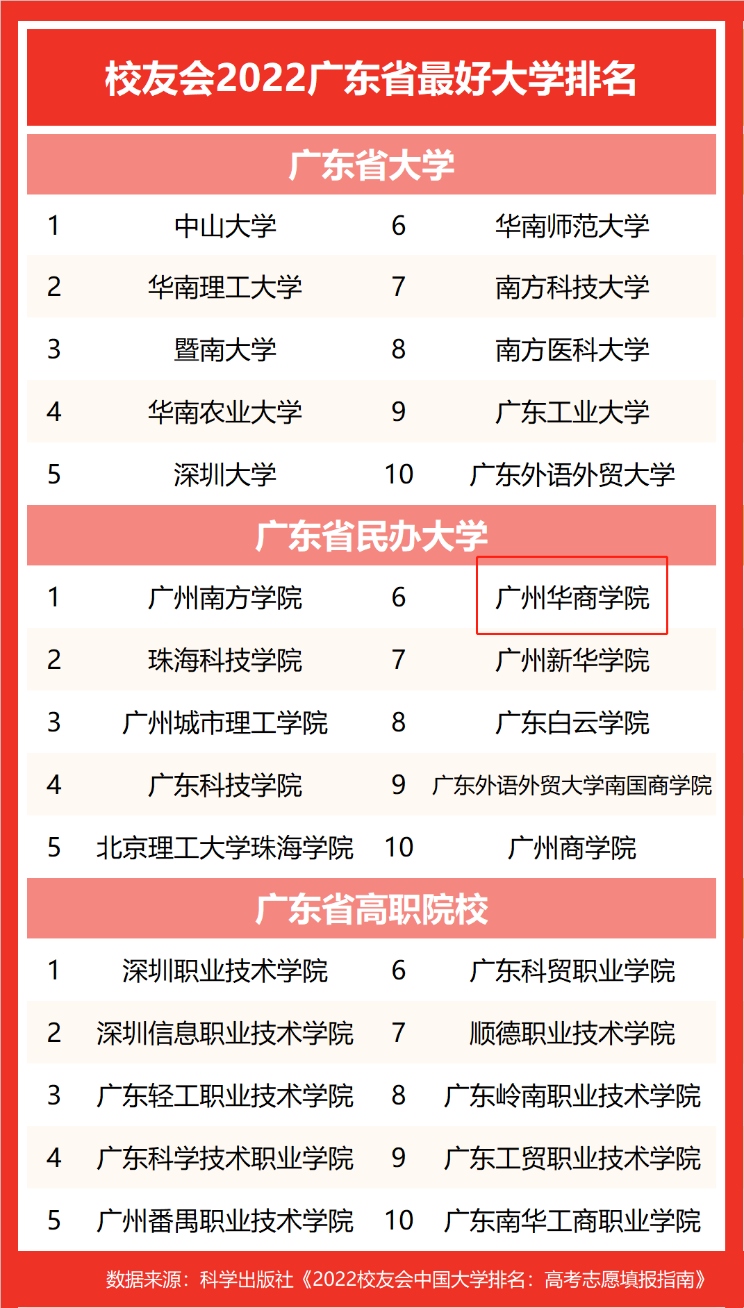 2022全国高考即将来临,为了给全国各地考生选择报考“广东省高校”提供权威参考,2022年4月15日,全国第三方大学评价机构艾瑞深校友会网(Cuaa.Net)撰写完成的《2022校友会中国大学排名:高考志愿填报指南》一书由科学出版社正式出版发行,最新发布校友会2022广东省最好大学排名、2022广东省最好民办大学排名等系列排名。