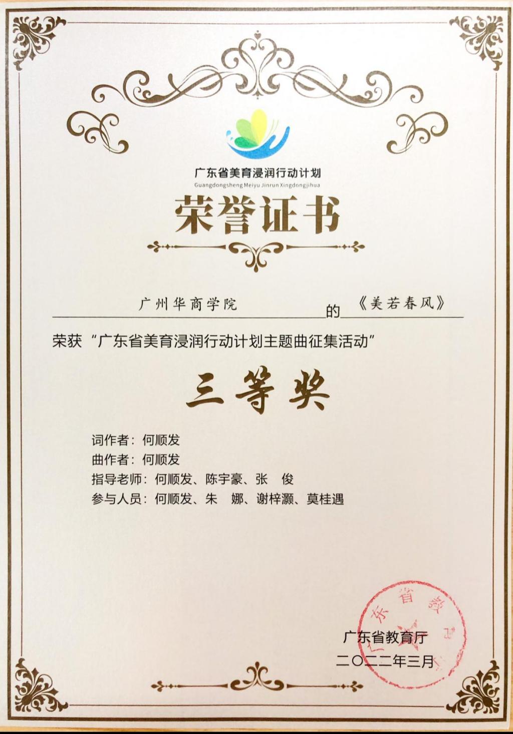 近日我校工会传来喜讯,外国语学院教职工何顺发等多位老师凭借作品《美若春风》荣获“广东省美育浸润行动计划主题曲征集活动”三等奖。