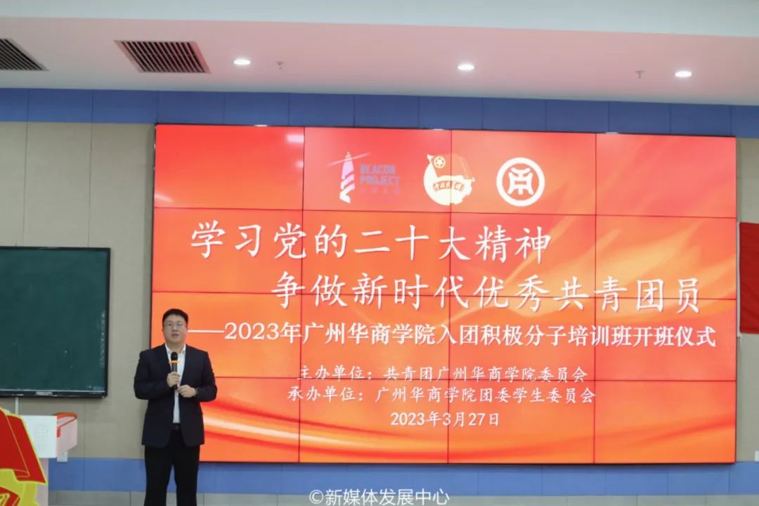 广州华商学院副校长、四会校区党委书记、管委会主任王卫平教授,四会校区党委委员、管委会副主任、学校教务处段晓聪副处长,四会校区党委委员、管委会副主任、学团办付蔚莹主任,四会校区党委委员、教师教育学院辅导员江庆基,学校团委专职团干,二级学院团委书记、团委副书记及2023年入团积极分子培训班学员代表参加本次开班仪式。仪式由校团委书记陈刚主持。