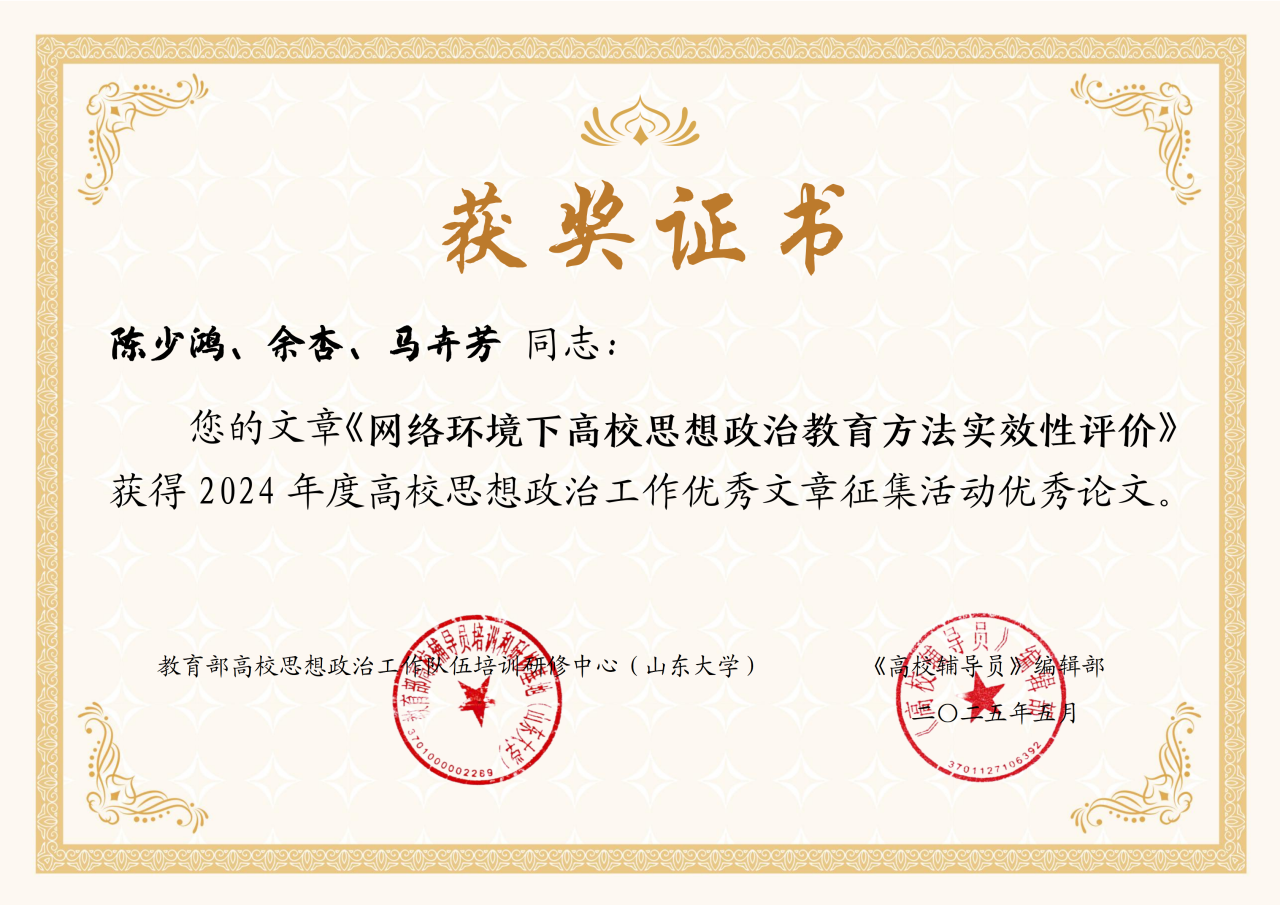 近日,教育部高校思想政治工作队伍培训研修中心(山东大学)与《高校辅导员》编辑部公布了2024年高校思想政治工作优秀文章征集活动评选结果。我校陈少鸿、余杏、马卉芳同志的文章《网络环境下高校思想政治教育方法实效性评价》荣获优秀论文奖项。