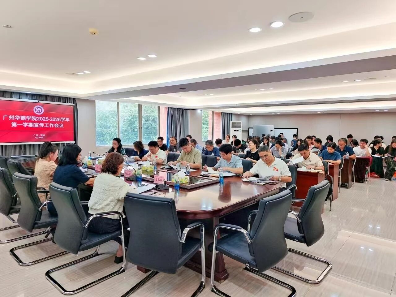 喜迎中华人民共和国成立76周年,做好迎二十周年校庆、迎本科教学工作合格评估,是当前我校宣传思想文化工作战线的“头等大事”。为进一步增强推动宣传思想工作守正创新的责任感和使命感,开创学校高质量发展新局面,着力提升学校宣传思想文化工作水平,守好意识形态安全关口,深化校园精神文明建设,为学校双迎工作营造良好的舆论氛围,9月25日上午,广州华商学院2025-2026学年第一学期宣传工作会议在广州校区行政楼502会议室召开。学校党委书记陈玉欢出席会议,各职能部门、各二级学院单位宣传负责人、宣传联络员参加会议。会议由党委委员、党委宣传部部长刘苗主持。