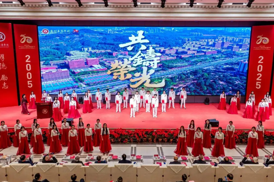 会上,由廖榕就董事长作词创作的校歌《共铸荣光》MV首发。在全体齐唱校歌的激昂旋律中,广州华商学院建校20周年发展大会落下帷幕。