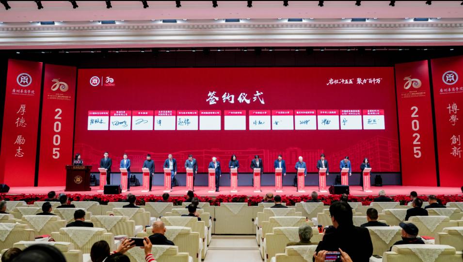 12月26日,广州华商学院建校20周年发展大会在华商会议展览中心华僖礼堂举行。大会以“启程‘十五五’ 聚力‘百千万’”为主题,回顾二十载办学征程,凝聚发展共识,汇聚奋进力量,全面开启学校“十五五”高质量发展新篇章。大会邀请各级领导、教育界同仁、企业合作伙伴及社会各界贤达出席,通过新华社、羊城晚报等多个平台进行网络直播。