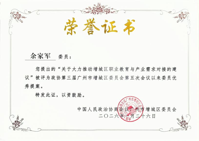 聚焦实需求,双案获答复。余家军提交的《关于大力推动增城区职业教育与产业需求对接的提案》与《关于建立健全港澳青年来增城创业服务机制的提案》,先后收到了广州市增城区教育局、增城区人力资源和社会保障局的正式答复函。其中,《关于大力推动增城区职业教育与产业需求对接的提案》获评“委员优秀提案”。该提案紧扣增城“12613”现代化产业体系建设需求,直击职业教育专业设置滞后、校企合作不深、师资结构失衡的核心症结,紧扣“芯”“显”“车”等重点产业人才缺口,提出加大财政扶持、打造产教融合样板、集聚“双师型”人才的精准举措,破解人才供需错位难题。
