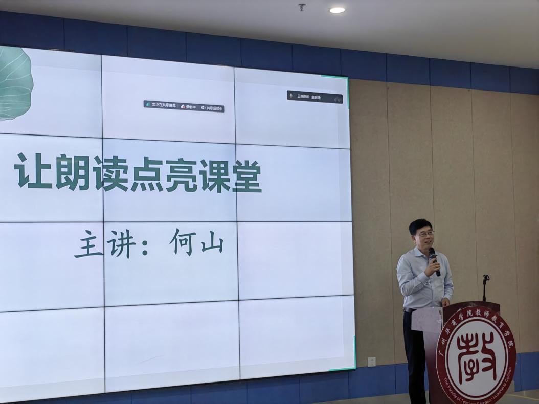 朗读是一门艺术,更是语文课程不可或缺一部分。为加强教师教育学院学子们对义务教育语文课程核心素养的认识,2023年6月1日晚上,教师教育学院邀请了何山老师在四会校区8号楼109举办讲座。莅临本次讲座的嘉宾有珠海市金湾区第二小学教育集团李彩芳总校长、小学教育专业负责人李志厚教授、王婧琪老师、四会校区党委委员、教师教育学院辅导员江庆基老师、小学教育系专任老师赵中宝老师、教师教育学院专任教师刘东伟老师、高婕老师、教师教育学院专任教师助教陈文玲老师,本次讲座的主讲人为珠海广电传媒控股有限公司副总经理何山老师,讲座由李志厚教授主持,教师教育学院2022级学生参加此次讲座。