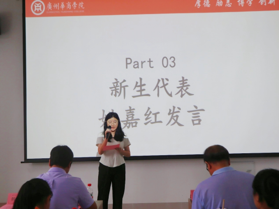 新生代表姚嘉红同学表达了自己对大学生活的向往,期待未来更多的机遇和挑战,期待结交八方英才,期待四年后变得更加成熟稳重和自信。声动人心,铿锵有力。