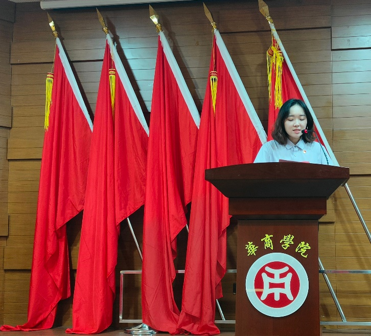 广州华商学院纪委委员、纪检办主任、党办副主任黄秋铭同志代表中共广州华商学院委员会宣读《关于同意召开中国共产党广州华商学院会计学院党员大会的批复》。