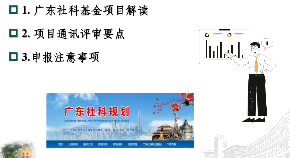 付秋芳教授首先对广东省社科基金的体系进行了详细解读。他指出,广东省社科基金体系与国家社科基金体系相似,除了常规项目外,还包括后期资助项目、大湾区研究专项、岭南文化项目等多个专项项目。他强调,申请人应持续关注广东省社科基金网站,以便及时把握申报机会。付教授还提到,尽管广东省社科基金不提供课题指南,但提供的项目多,尤其是近年来粤港澳大湾区等热点,创造了更多的科研需求。