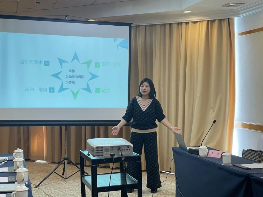 实践是检验真理的唯一标准。李副教授不仅讲解了理论,还亲自示范了3、5、7、9基本节奏型的声势练习,以及音乐记忆训练案例(如音节记忆《大鱼和小鱼》)。从字词、名字的节奏读诵,到古诗、谚语的节奏简单句练习,再到儿歌、童谣的节奏游戏,每一个环节都充满了趣味性和互动性,让老师们亲身体验到了奥尔夫教学法的魅力所在。