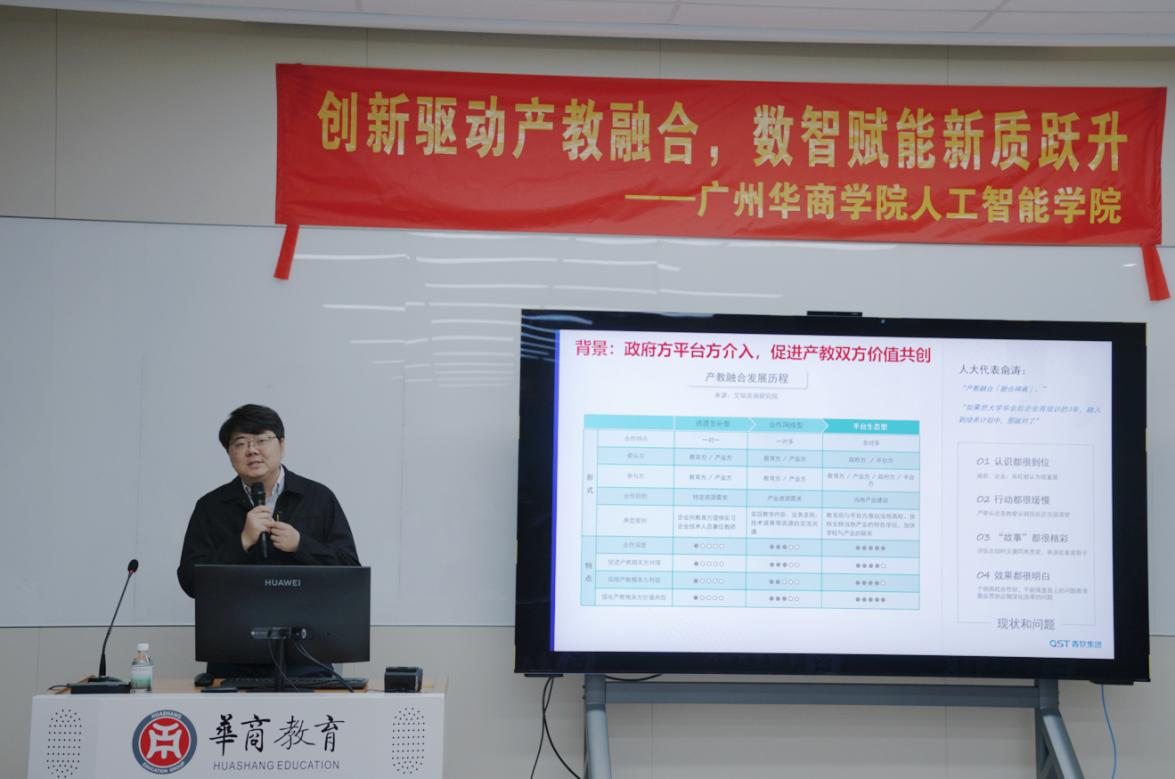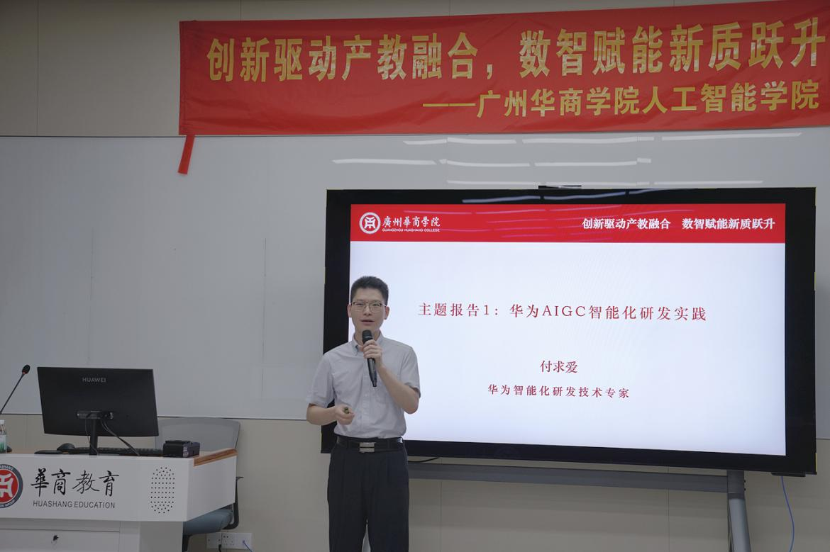 2025年3月22日下午,广州华商学院人工智能学院在弘美楼310室成功举办了主题为“新质生产力驱动下的产教融合范式创新”的研讨会。此次研讨会汇集了学术界与产业界的多位专家和领导,共同探讨在人工智能时代下,如何通过产教融合的新模式与新路径,促进教育与产业的深度结合,培养适应未来科技发展的高素质人才。出席研讨会的嘉宾与领导包括:华为智能化研发技术专家付求爱,青软创新科技集团股份有限公司副总裁韩涛,东莞理工学院工业软件学院副院长丁凯,广州华商学院党委副书记、纪委书记兼副校长吕峻闽,人工智能学院副院长叶仕通,党委副书记兼副院长陈洋广,院长助理洪绍勇、杨本胜,以及人工智能学院全体教师。研讨会由广州华商学院人工智能学院党委书记、副院长杨波主持。
