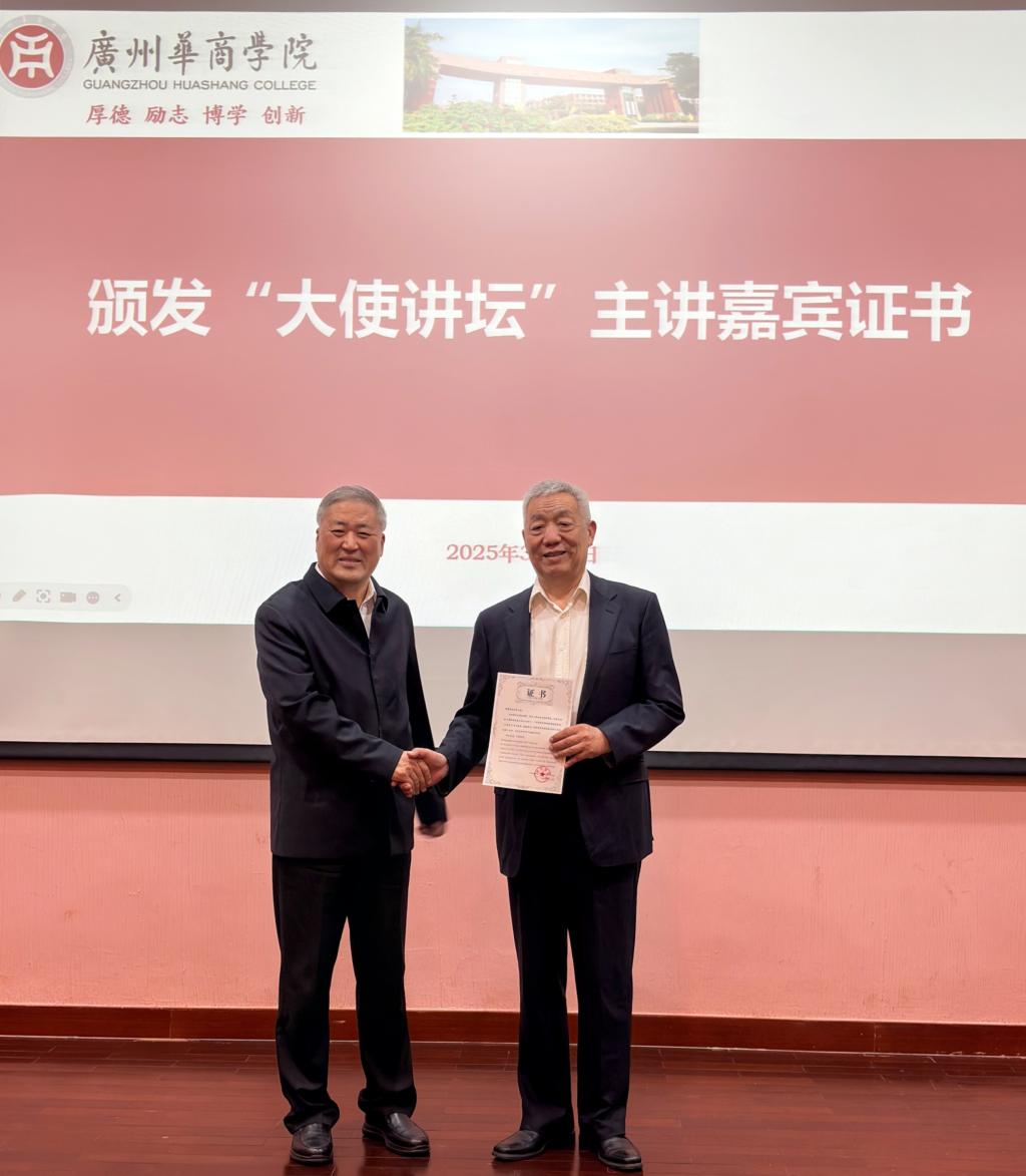 (广州华商学院校长胡军为沈永祥大使颁发“大使讲坛”证书)