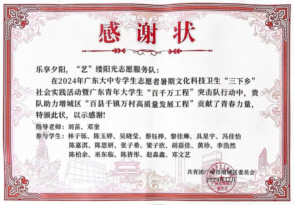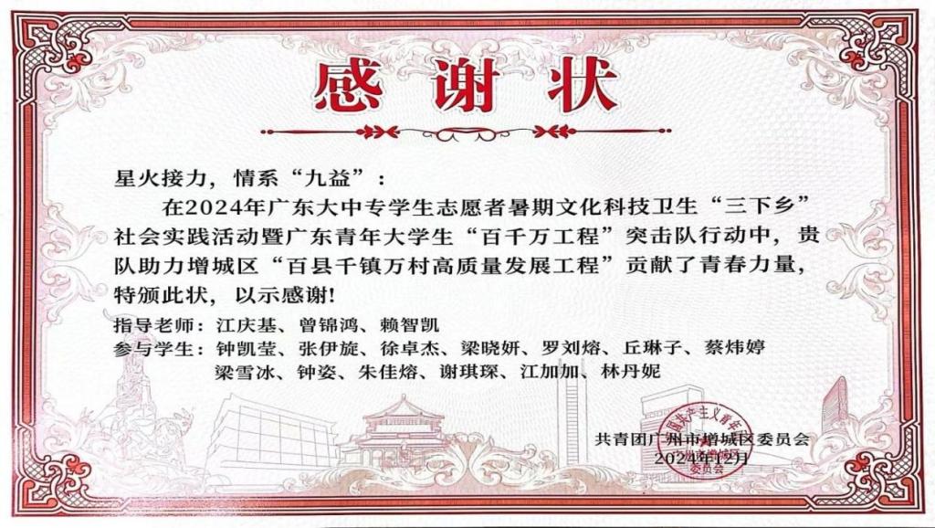近日,广州华商学院教师教育学院组建的“星火接力,情系‘九益’”“点亮‘小楼’,暖心筑梦”“乐享夕阳,‘艺’缕阳光”三支社会实践队伍,因在增城区“百县千镇万村高质量发展工程”中表现突出,荣获共青团广州市增城区委员会颁发的感谢状。这是对教师教育学院学子践行社会责任、服务基层发展的充分肯定,彰显了华商学子在乡村振兴中的青春担当。