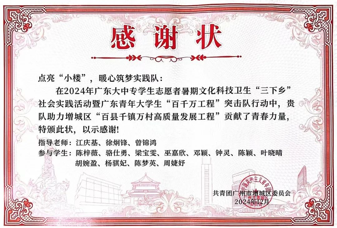 实践队员们充分发挥专业优势,将高校教育资源与基层需求紧密结合,为乡村教育注入创新活力,推动传统文化传承与社区文明建设。共青团广州市增城区委员会在表彰中高度评价,三支队伍以实际行动诠释了新时代青年的责任与使命,为“百千万工程”提供了生动的实践范本。
