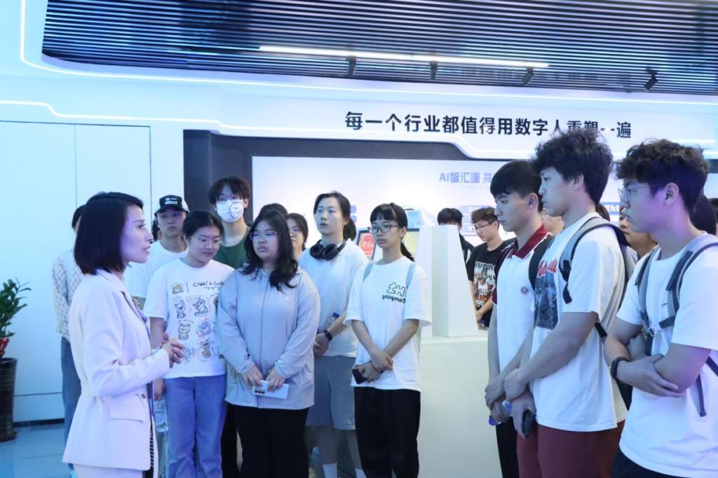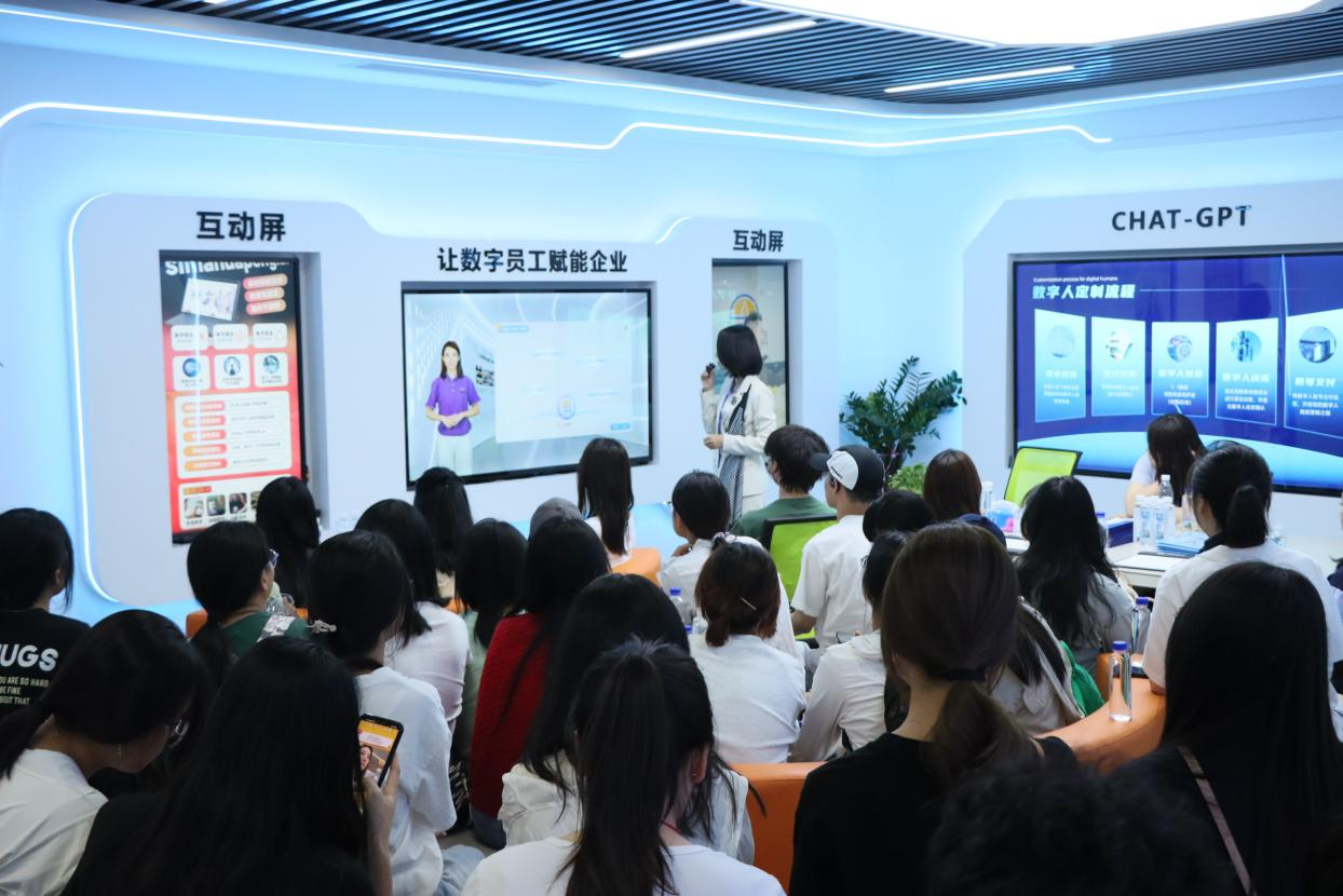 师生实地探访广量集团AI展厅。广量商学院执行院长王佩现场演示了人机互动系统24小时智能问答、大数据抓取与知识库调用、隐私保护与知识产权安全等核心功能,该系统能快速回答各类问题,展现AI在信息处理与决策支持中的高效性。她强调,数字人技术已应用于讲课、直播、跨境电商等场景,尤其在本地生活类直播潜力巨大。同时,她也鼓励大学生积极学习AI技能,主动拥抱AI技术变革,理解底层逻辑并掌握工具适用领域。