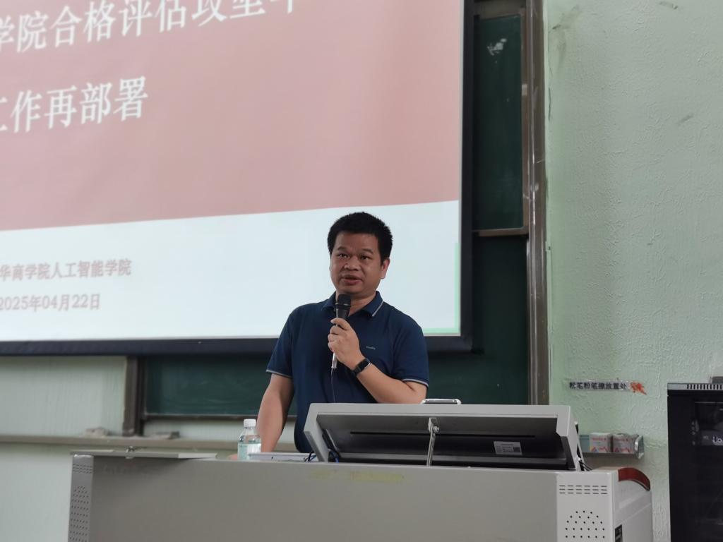 2025年4月22日下午,广州华商学院人工智能学院在励志楼D408召开2024-2025第二学期第二次全体教职工大会。会议围绕合格评估,对学院重点工作进行了再部署和再动员。会议由戴经国院长主持,学院全体教职工参会。