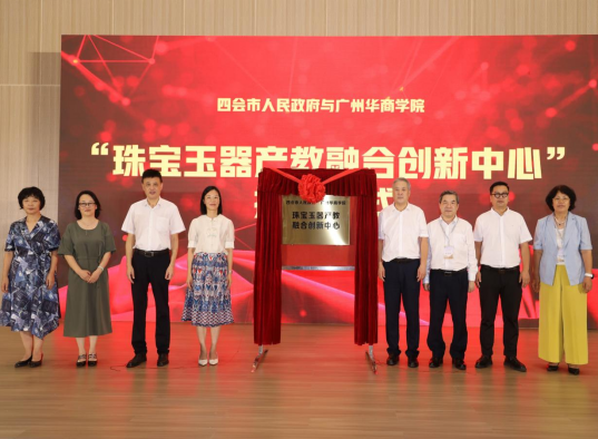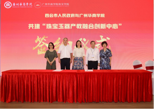 2025年6月24日上午,四会市人民政府与广州华商学院共建“珠宝玉器产教融合创新中心”签约及揭牌仪式在广州华商学院(肇庆校区)举行。四会市委常委、统战部部长、市政协党组副书记蔡雪丽,四会市珠宝玉器产业发展管理中心主任黄振敏,广州华商学院校长胡军教授、副校长焦方太教授、肇庆校区党委书记苏宁同志、校长助理覃少冰、珠宝学院院长朱晓红教授等领导出席签约现场,参加会议的还有众多院校专家学者、业界精英、本校相关职能部门的负责人、二级学院负责人以及优秀学生代表。