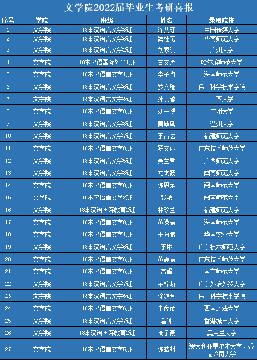 又是一年收获季,又是一年报喜时。近日,文学院2022届毕业生在全国硕士研究生考试中捷报频传,考研成绩喜人,再创历史新高。文学院共有27名同学脱颖而出,以优异的成绩被中国传媒大学、华南师范大学、广州大学、广东外语外贸大学等知名院校录取。