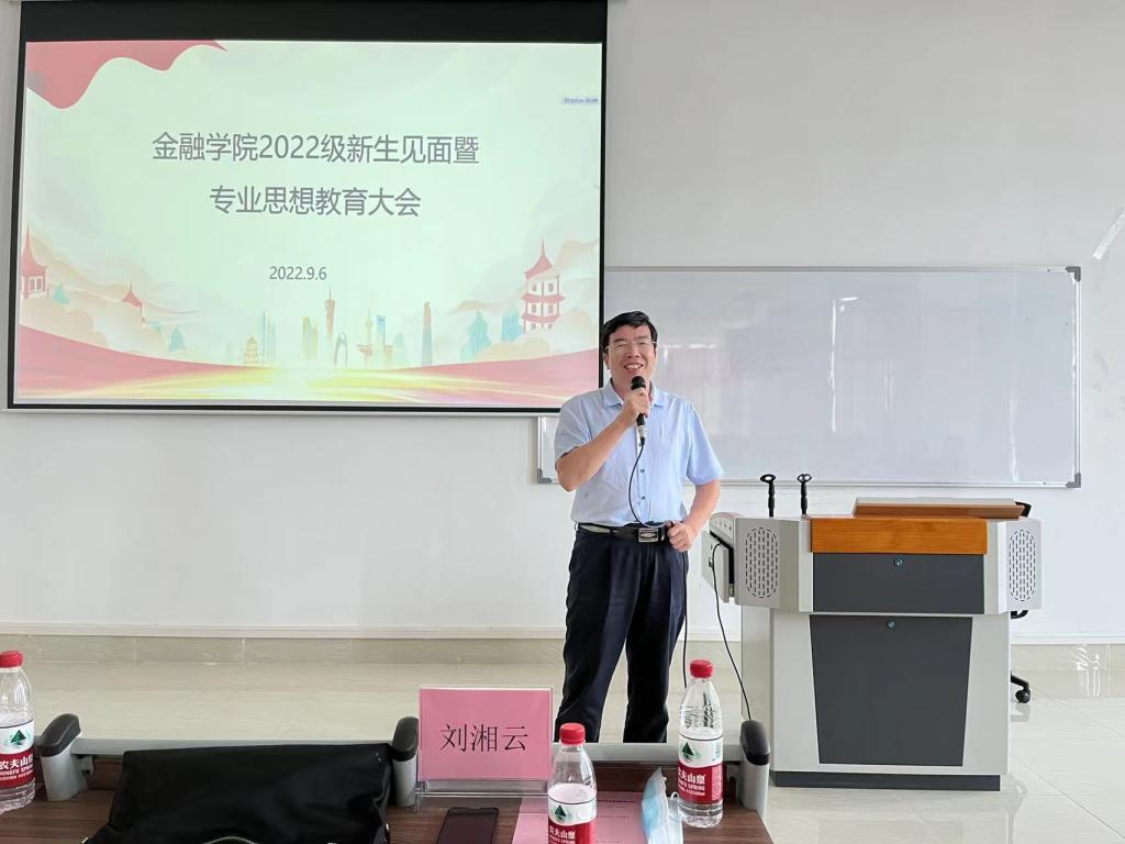 会上,刘湘云院长向金融学院全体22级新生的到来表示热烈欢迎。从源远流长的专业背景到面向未来的建设规划;从现有的名家名师到不断引进的国内、国际一流人才;从专业发展前景到学院特色三大平台,刘湘云院长全面介绍了金融学院及各专业的历史、现状及远景。他寄语22级新生,要正确看待金融热点与行业发展,立志成为时代所需的复合型、高端型金融人才;要具备正确的职业操守,增强才干,为实体经济和社会发展作出贡献;要学好本领,不仅有知识更要有强健的体魄和健康的心理,并祝愿全体新生在大学中学习好、生活好、身体好。