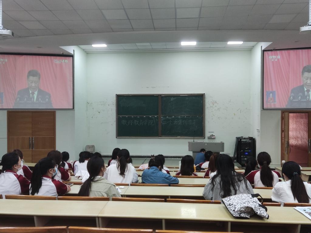 中国共产党第二十次全国代表大会10月16日上午在北京人民大会堂开幕。为迎接党的二十大胜利召开,激励广大华商青年永远跟党走、奋进新征程、建功新时代,教师教育学院组织学院的党员、团员、学生骨干代表在励志楼A108教室观看中国共产党第二十次全国代表大会开幕式直播。