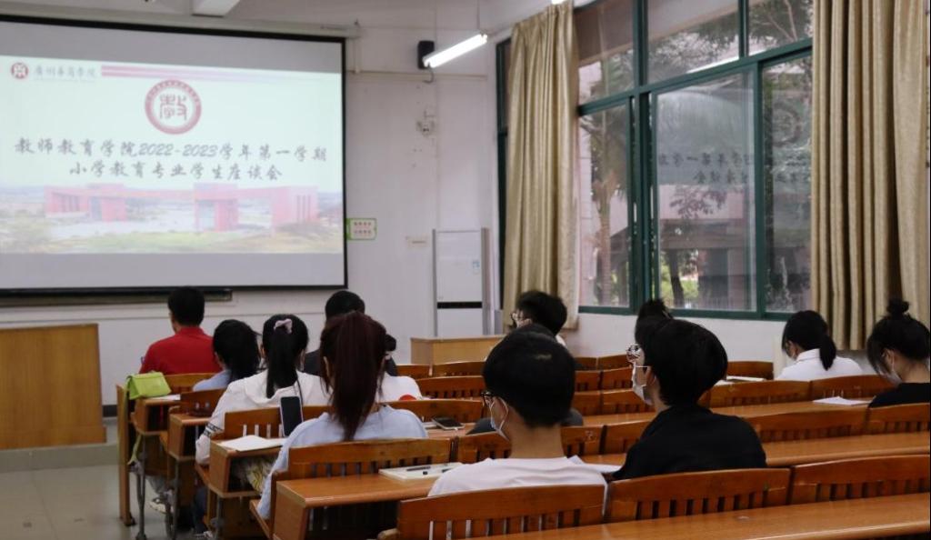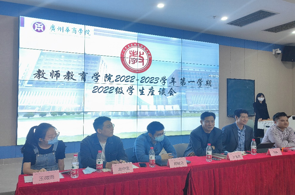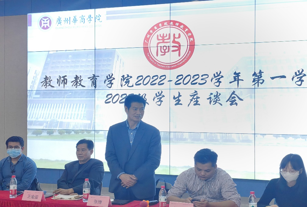 为深入了解开学以来各年级学生在学习、生活等方面情况,加强师生联系,教师教育学院于教学周第十周分别在增城校区和四会校区开展2022-2023学年第一学期期中学生座谈会。此次会议由教科办黄咏渝老师主持,参与学生座谈会的领导、老师有王金道院长、张博副院长、教科办黄梓芬主任、小学教育系主任王符教授、基础理论教学部郑皓元主任、学前教育艺术理论教研室殷山红主任、小学教育系潘昕迪副主任、教师代表以及各年级辅导员。