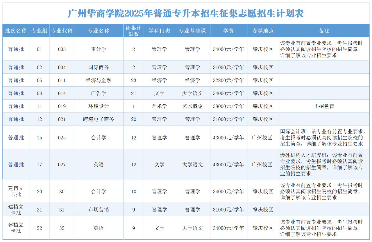 根据《关于做好广东省2025年普通高等学校专升本招生征集志愿工作的通知》,结合《广州华商学院2025年普通专升本招生简章》的要求,现对我校2025年普通专升本普通批、建档立卡批计划进行统一征集,具体征集志愿事项公告如下: