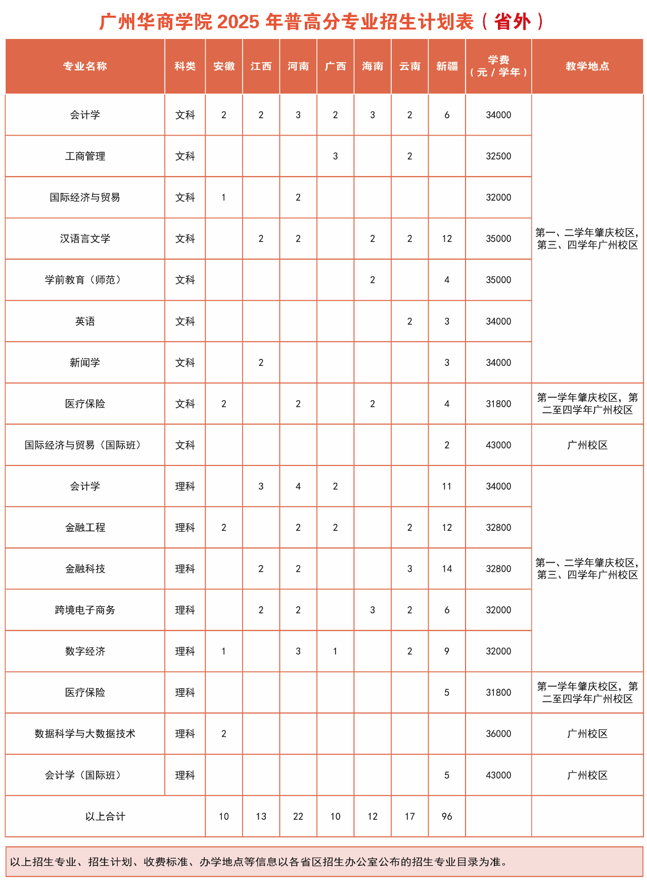2025年,广州华商学院面向全国8个省(区)投放6300个招生计划,共开设53个本科招生专业,涵盖了经、管、文、工、艺、教、医等7大学科类。