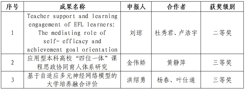 近日,广东省高等教育学会公布了《关于公布广东省高等教育学会第三届高等教育研究优秀成果奖评选结果的通知》(粤高教学会〔2024〕14号)。我校共有3项成果获奖,其中,荣获高等教育学术论文二等奖1项,三等奖2项。