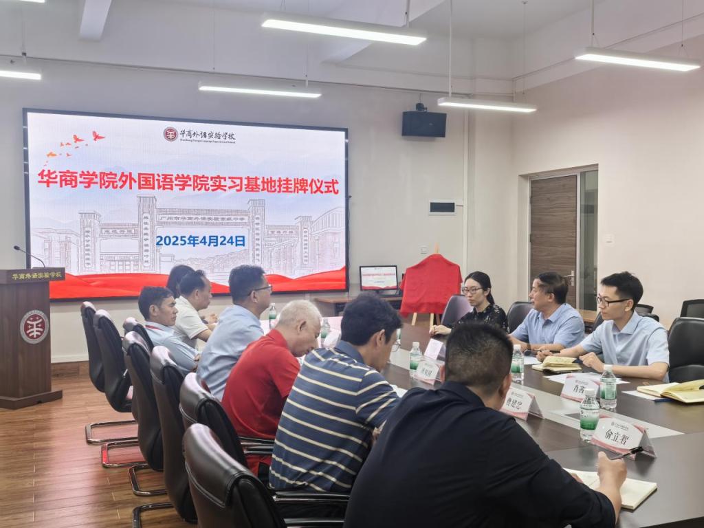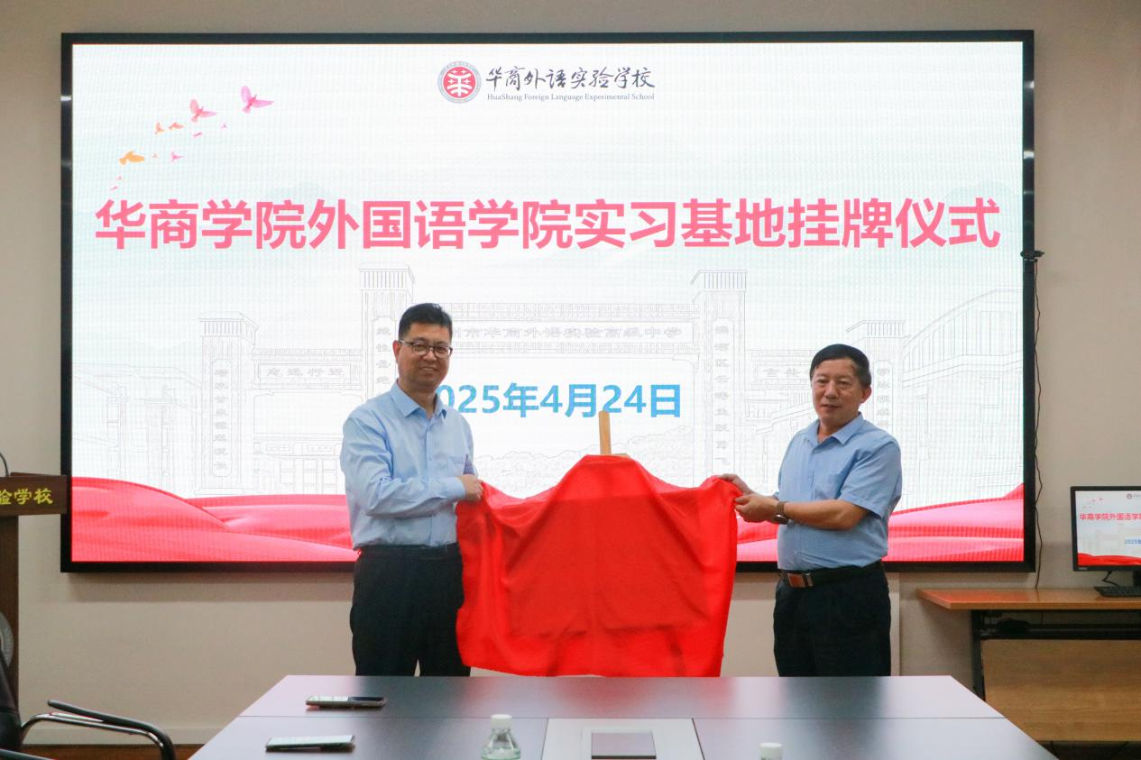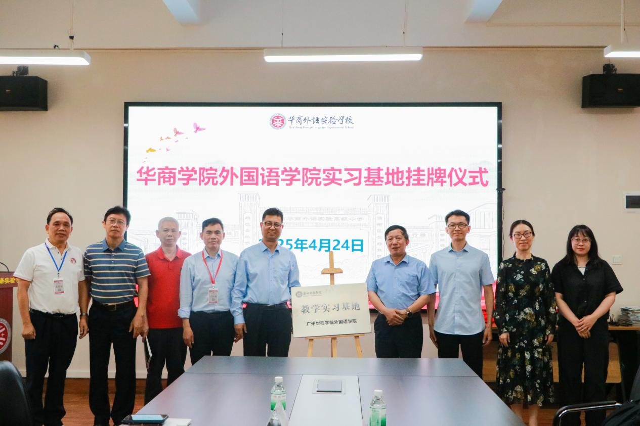 2025年4月24日下午,广州华商学院外国语学院一行前往广州市华商外语实验学校,举行共建实习基地挂牌仪式。出席此次活动的有华商外语实验学校总校校长赵秉乾、副校长唐双同、付红根、曹建忠、卢岳飞,学校办公室主任俞立智、教学助理董小雪老师及教师代表;广州华商学院外国语学院院长肖坤学、副院长何顺发,以及肖霄老师、肖茜老师。