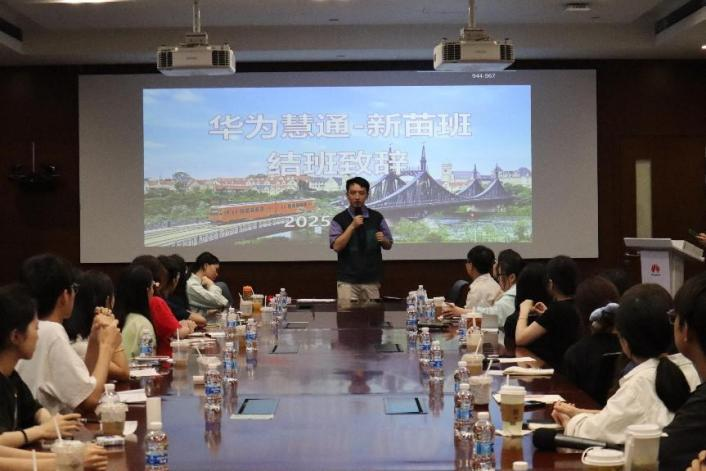 授课结束后,迎来了新苗班的结班及Co-op项目启动仪式,作为校方代表,广州华商学院管理学院党委书记兼副院长、人力资源产业学院执行院长袁仕海副教授致辞,他指出,此次新苗班的开设对广州华商学院管理学院而言,不仅是一次产教融合的典范实践,更是启动Co-op项目革新人才培养的关键之举。通过与华为慧通商务有限公司的合作,学院得以将企业真实的商务运营场景、前沿的管理理念和数字化商务技术引入课堂,推动课程体系的迭代升级,同时袁仕海书记也对新苗班同学的表现表示高度赞赏,他指出此次结课是大家职业征程的新起点,需以“长板效应”强化团队协作,在实践中验证理论,在创新中追求卓越。