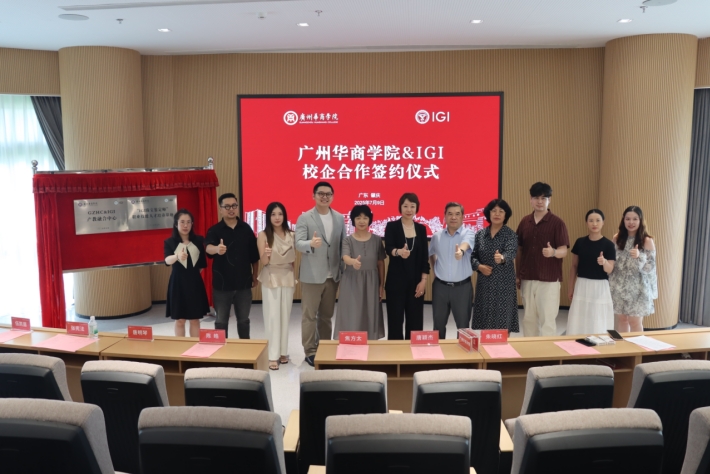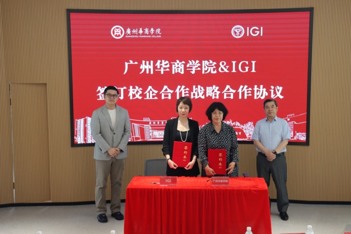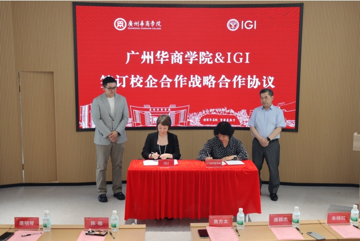 在全场嘉宾的见证下,广州华商学院产教融合办公室主任唐明琴与IGI培训总监陈皓作为双方代表签订战略合作协议。广州华商学院副校长焦方太与IGI企业培训总监唐颖杰作为见证人,共同见证这一时刻。