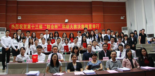 2015年5月13日18点30分,由广东财经大学会计学院主办的第十三届“财会杯”科研大赛决赛在其北校区北3-103研究生学术报告厅隆重举行,我院的刘彩兰老师应邀担任本次大赛的评委之一。我院代表队伍Super Team队(队长:李东明,队员:邓锦兴、黄敏仪、黄慧娴)在广财大总决赛的舞台上力战四路群雄,表现优异,最终获得“三等奖”的好成绩,只是以微弱的差距落后于获二等奖广东金融学院。